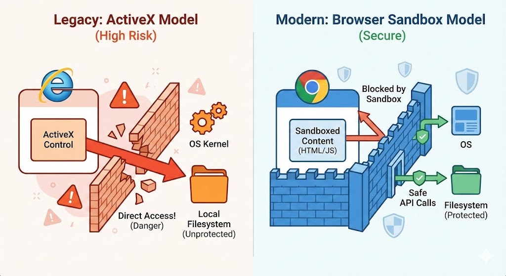 現代のブラウザは「サンドボックス」という隔離された箱の中で動くのが常識だ。しかし、ActiveXにはその壁がない。