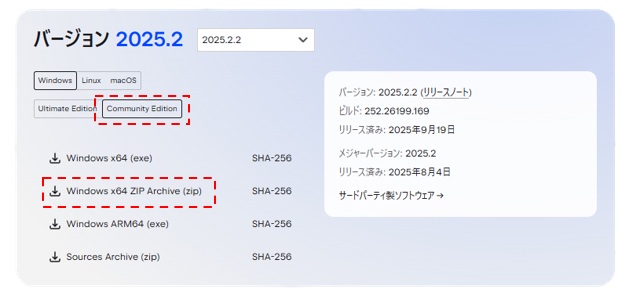 JetBrainsの公式サイトから、先ほど確認したビルド番号に対応する IntelliJ IDEA Community Edition をダウンロードする。