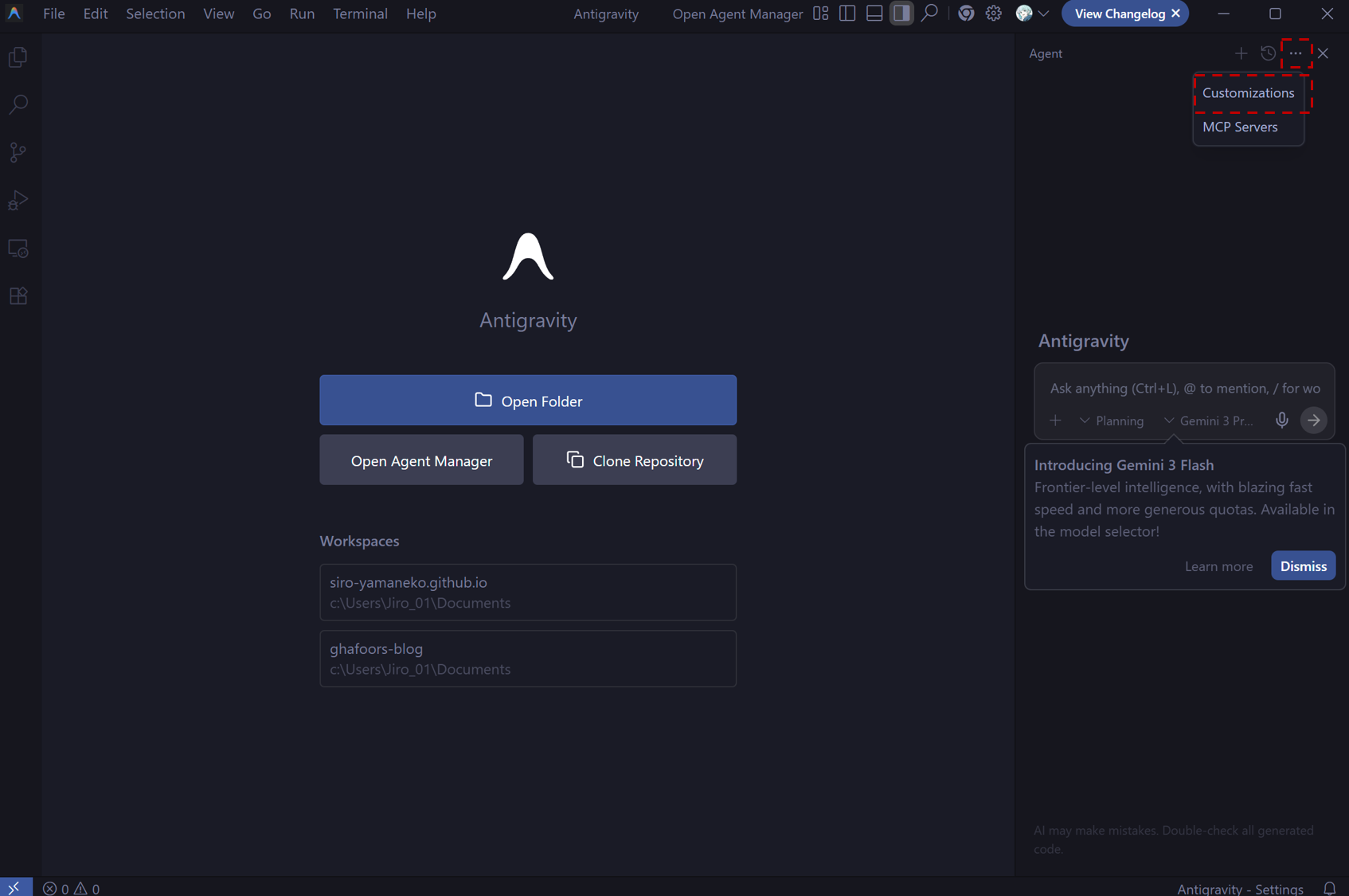 ここはAntigravityの中でも、最も重要な設定項目と言っていい。
