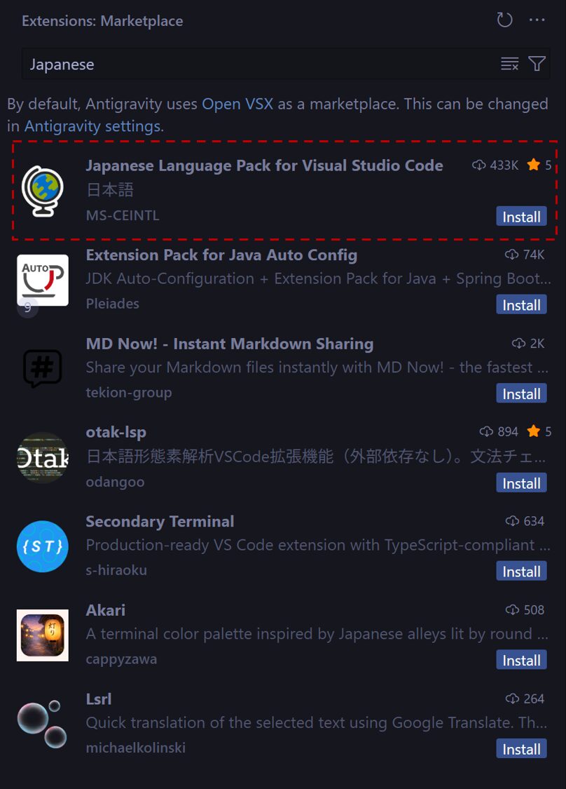 Antigravityのメニューを日本語化する手順を解説する。