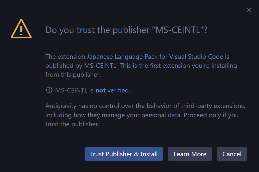 Antigravityは安全性確保のため、未確認の発行元に対して警告を表示する。