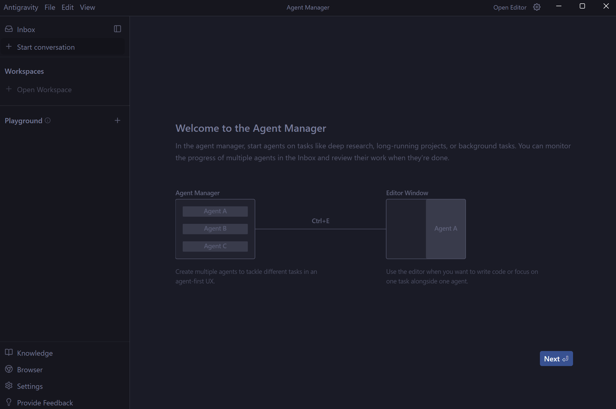 Editorが「手を動かす場所」だとすれば、Agent Managerは仕事を振る司令塔に近い。