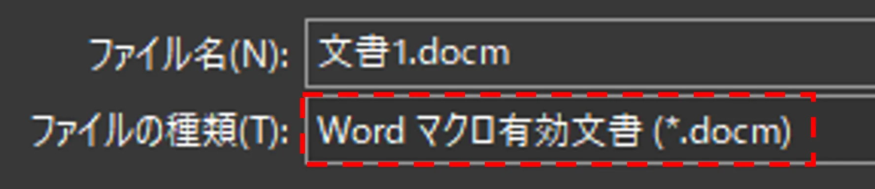 保存ダイアログで、ファイルの種類を「Word マクロ有効文書 (*.docm)」に変更して保存しよう。この形式でないと、せっかく作った自動化の仕組みが次回開いた時に動かなくなる。