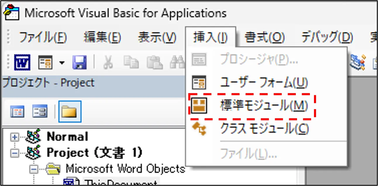 - メニューの「挿入」→「標準モジュール」をクリック。
