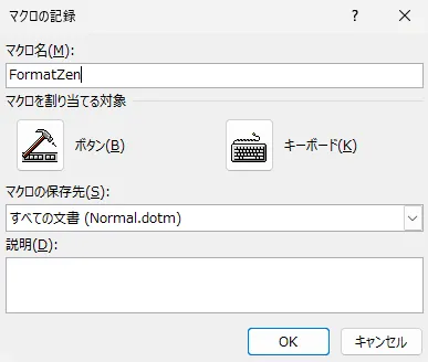 FormatZen)。「マクロの保存先」は、現在開いている文書か、すべての文書で使いたいなら「Normal.dotm」にする。